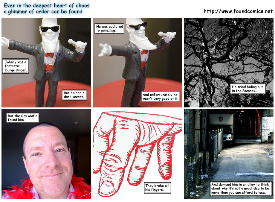 As you hopefully know, Found Comics is based on randomly generated images. A keyword search is used to pull a series of six photos from the internet. Then hilarious text is added to make the photos appear to be a real comic.