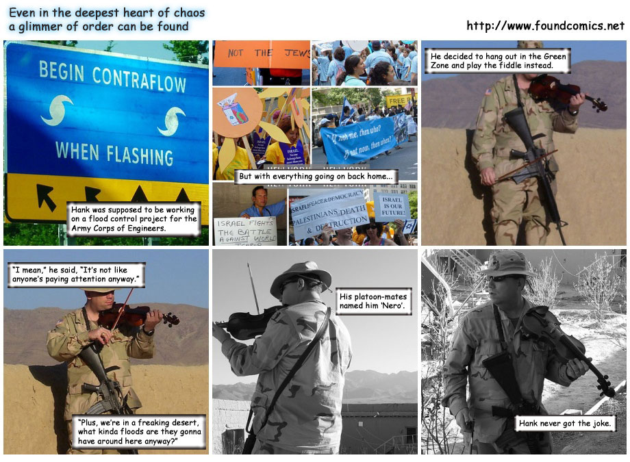 1. FEMA resolves, 2. Israel Salute Day - New York Shame Day, 3. Do you like my weapons of mass destruction?, 4. Fiddlin' in Afghanistan., 5. Black and white of me, sawin' on the fiddle in Afghanistan., 6. Wait! I think I see Osama!
